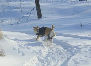 You can see that because it is so cold, the girls are sporting fleece 'coats' made by my husband Steven and myself. When I first put the coats on the dogs, it is quite comical because they stand there like statues, not quite knowing what to do! But then as soon as I get them moving, they seem fine, and hopefully warmer too.